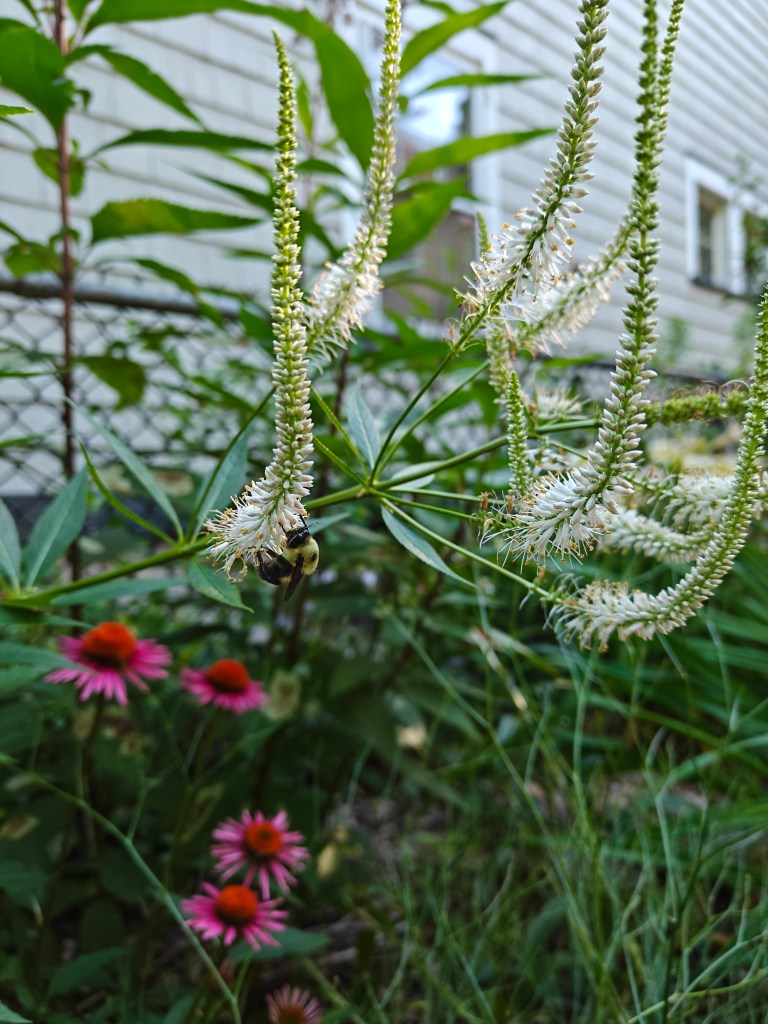 A bee helps itself to the triton-esque spires of Culver’s root, Veronicastrum virginicum. This plant grew rapidly and had bees on it every time I passed by. An E. purpurea cultivar begins to bloom in the background.